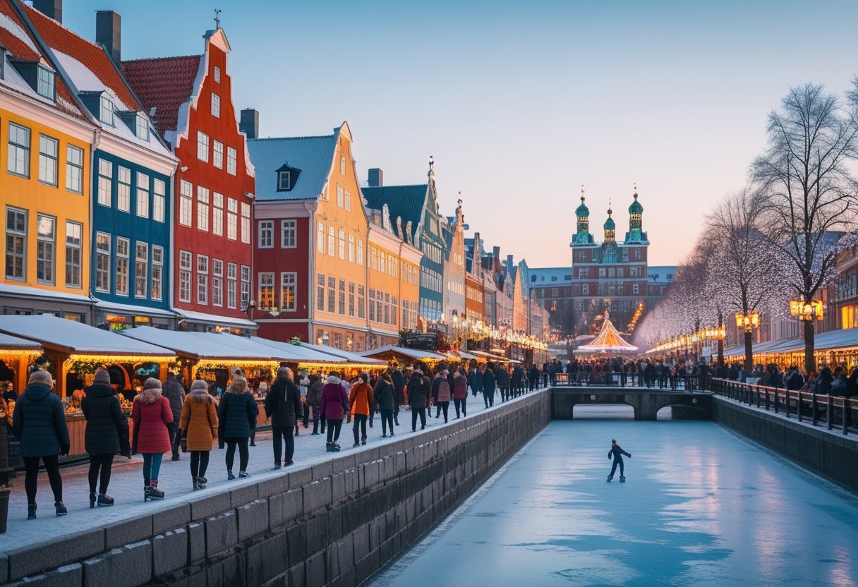 Visitors enjoy cozy cafes lining the waterfront, offering warm beverages and traditional Danish cuisine. Ice skating is popular during the colder months, adding to the vibrant atmosphere.